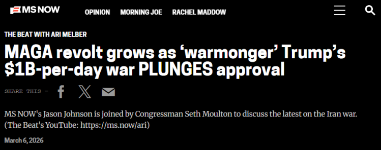 英国《每日电讯报》网站3月8日报道中,展示了美国社会对美国加入以色列的战争而“牺牲美军”的反对声音。