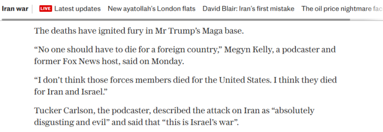 不过值得注意的是,在不同媒体的报道中,有美国政府和军方强调的“阵亡美军士兵为国家做出了牺牲是英雄”,也有美国民间的声音甚至是原本特朗普阵营的支持者认为,“这些军人不是为美国牺牲的,而是为以色列而死”“没有人应该为外国而死”“这就是一场以色列的战争”。