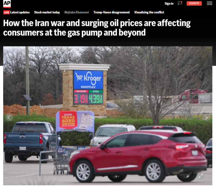 美联社3月10日的报道详细讨论了这场冲突对美国消费者的影响。报道称,油价飙升可能是美国通胀的一个重要因素。随着战争继续,所有东西的价格都可能受到影响。