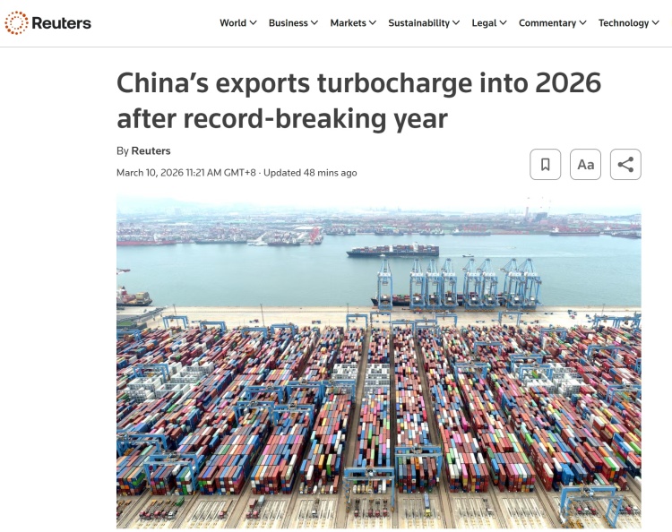 路透社的报道称,中国外贸在2026年迎来“开门红”,出口表现远超市场预期。