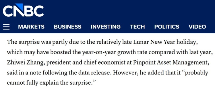 报道援引保银投资首席经济学家张智威的分析指出,部分超预期增长是由于今年春节假期较晚,可能推高了同比增速。但他强调,“这一因素无法完全解释如此大幅度的超预期增长”。