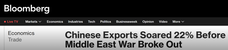 彭博社的报道称,中国今年前两个月的出口增速远超预期,在美以袭击伊朗扰乱全球贸易之前,中国出口额已迈向创纪录水平。
