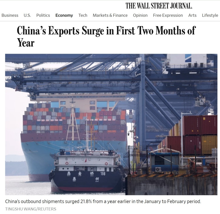 美国《华尔街日报》的报道指出,中国今年前两个月的出口增长超出预期,进一步巩固了其作为世界第二大经济体关键增长支柱的角色。