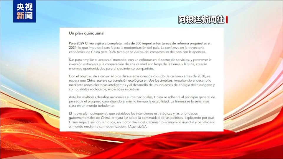 围绕中国政府工作报告和“十五五”规划,阿根廷新闻社报道称,中国将通过更有力的政策支持和改革举措,继续推动高质量发展、稳定增长和社会进步。
