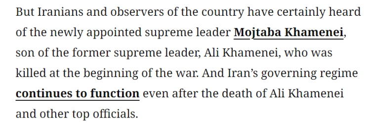 对此,美国有线电视新闻网报道指出,伊朗民众以及关注伊朗局势的观察人士肯定都听说过新任的伊朗最高领袖穆杰塔巴・哈梅内伊。即便在阿里・哈梅内伊及其他高层官员遇袭身亡后,伊朗政权仍在继续运转。