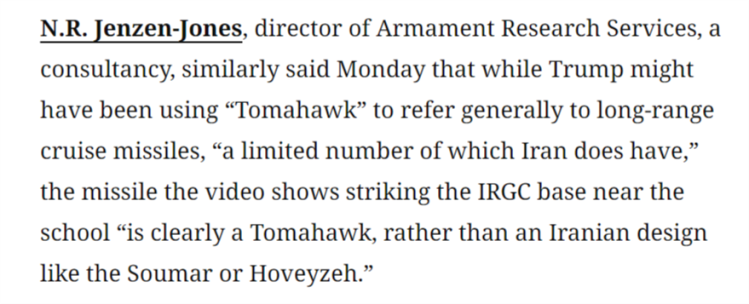 报道援引咨询机构“军备研究服务公司”(Armament Research Services)负责人詹森-琼斯的分析称,视频中击中学校附近伊朗伊斯兰革命卫队基地的导弹“显然是战斧导弹,而非伊朗设计的苏马尔或霍韦伊泽导弹”。