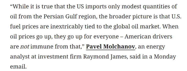 报道援引投资公司雷蒙德·詹姆斯能源分析师帕维尔·莫尔恰诺夫的观点指出,“虽然美国从波斯湾地区进口的石油数量有限,但从整体来看,美国燃油价格与全球石油市场密不可分。油价上涨时,所有国家都会受到影响,美国司机也无法幸免。”