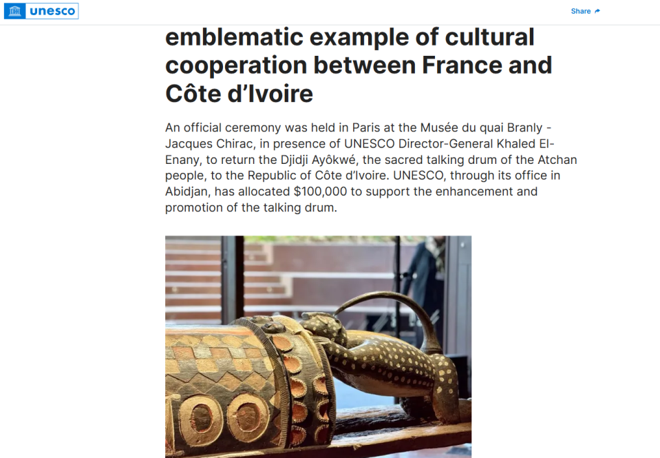 “会说话的鼓”是法国向科特迪瓦归还的第一件文物。科特迪瓦还在追索其他近150件文物。联合国教科文组织表示,此次文物归还,标志着非洲被殖民列强掠夺文化遗产的修复工作又迈出重要一步,为全球文物返还行动树立了新典范。