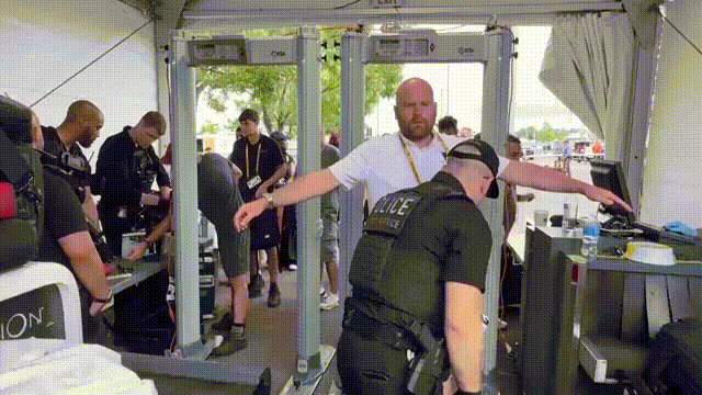 安保人员对进入体育场的人员进行安检。
