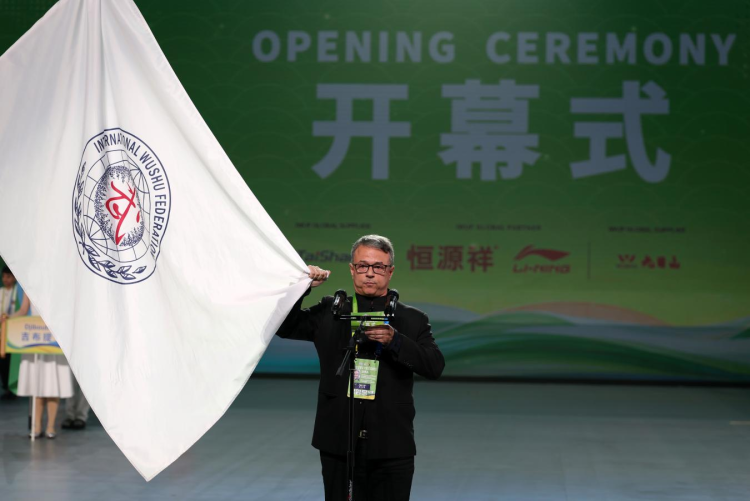 现场奏响国际武术联合会会歌,全体人员起立,向国际武联会旗行注目礼。随后,运动员代表汪静宜、裁判员代表马库斯・阿尔维斯先后登台宣誓,郑重承诺恪守体育道德、遵守赛事规则,以公平公正的态度完成各项竞赛工作。