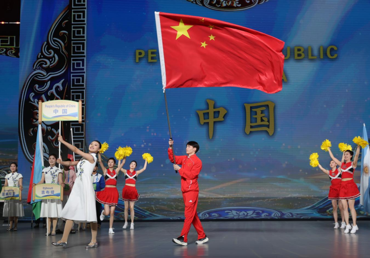 在昂扬的乐曲声中,各参赛代表团依次入场,全场报以热烈掌声。东道主中国代表团压轴登场,现场掌声欢呼声此起彼伏,将入场仪式气氛推向高潮。