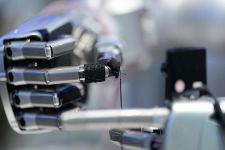 灵心巧手展台的三款“灵巧手”各有绝活。工业级L20手拥有21个自由度,完全映射人手技能,现场一款机器人正演示穿针引线。