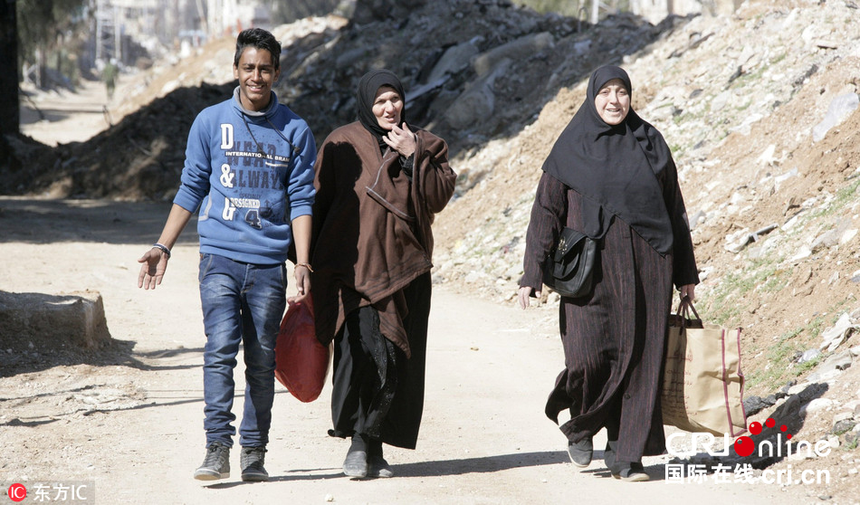 当地时间2017年2月6日,叙利亚大马士革郊外,叙利亚家庭陆续返回al-Ziabiyeh地区。据媒体报道,因战火而离开al-Ziabiyeh地区的叙利亚民众在基础设施恢复后陆续返回家园。图片来源:东方IC