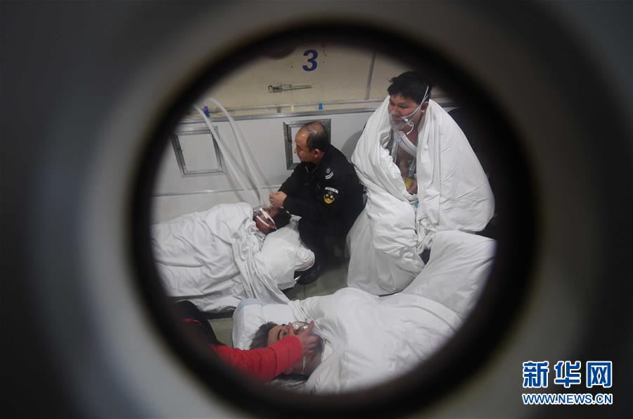 2月14日,几名被救出的伤员在娄底市中心医院的高压氧舱里接受救治。新华社记者李尕摄