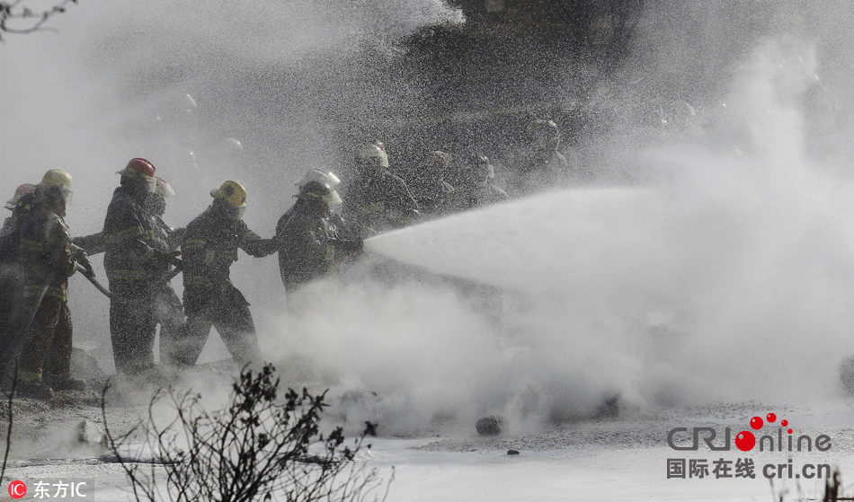 当地时间2017年2月15日,墨西哥萨波潘,墨西哥国家石油公司的输油管道发生爆炸,火势已持续20多小时,消防员和专家在现场灭火。图片来源:东方IC