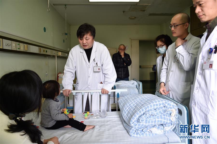 2月17日,福建省妇幼保健院小儿外科主任吴典明(左三)在病房询问小玉状况。新华社记者 宋为伟 摄
