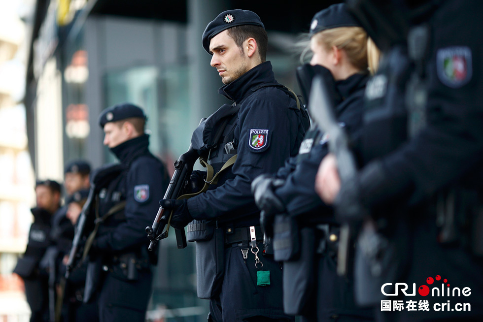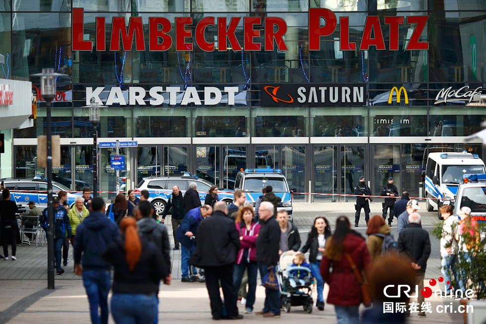 3月11日,在德国埃森,警察在受到袭击威胁的购物中心入口处警戒。据外电报道,德国警方11日得到埃森一购物中心可能发生袭击事件的情报,警方随即封锁了该购物中心及周边停车场。图片来源:视觉中国