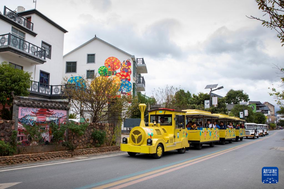 10月16日,游览“小火车”穿行在余东村。新华社发