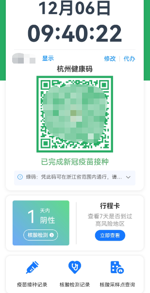 12月6日,浙江各地发布优化疫情防控举措第二日,一大早,有市民乘坐地铁打开健康码发现,原有的核酸检测3天倒计时小窗口已取消。