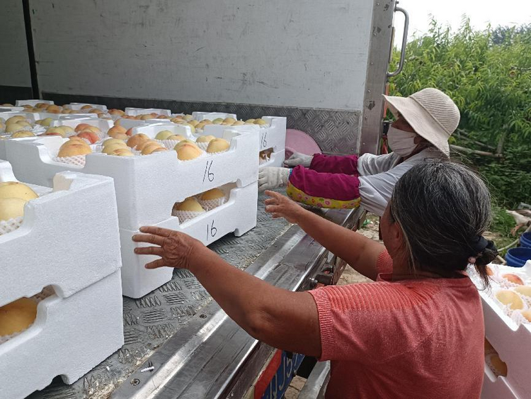 果农们将分装好的鲜桃装上货车