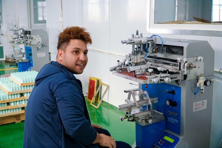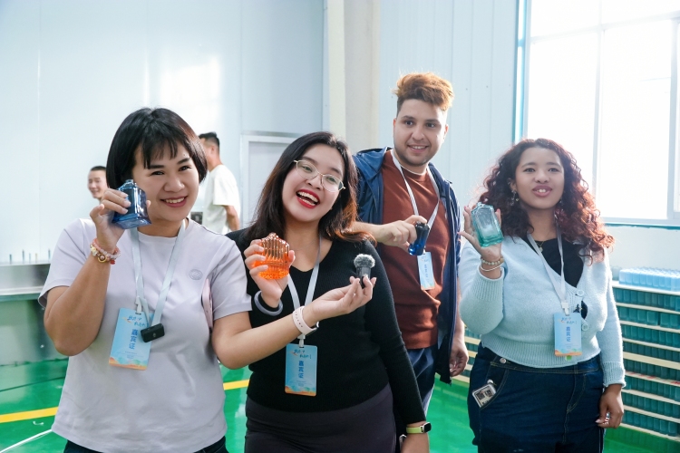 最让外国网红博主们兴奋的是丝印机操作体验环节。操作员先向大家演示如何固定玻璃瓶,随后手把手指导外国网红博主上手操作。“对准位置,轻轻按下开关就好。”在操作员的耐心指导下,来自埃及的外国网红博主成功在瓶身上印出精美logo,举起成品向镜头展示时笑着说:“这是我第一次体验玻璃印刷,太有成就感了,我可以在这里做很久!”