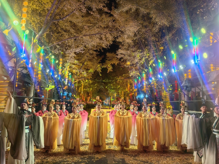 “衔月阁”通过光影艺术、夜间演艺、互动打卡等方式,将古建筑变为“可沉浸的剧场”;“黄金大道”则通过落叶铺设、灯光勾勒、诗词灯牌、心愿悬挂等设计,让游客不仅是观众,更是故事的参与者。