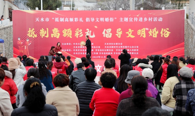 11月12日,由天水市委宣传部、市妇联、市文明办、市新时代文明实践中心办公室联合举办的天水市“抵制高额彩礼 倡导文明婚俗”主题宣传进乡村活动在甘谷县新兴镇孙家坪村举行。这场别开生面的主题宣传进乡村活动,凭借欢快的文艺演出、趣味的知识互动、贴心的便民服务与暖心的文化赠送,让200多名乡亲在欢声笑语中,卸下了高额彩礼的沉重负担,筑牢了文明婚俗的思想根基。