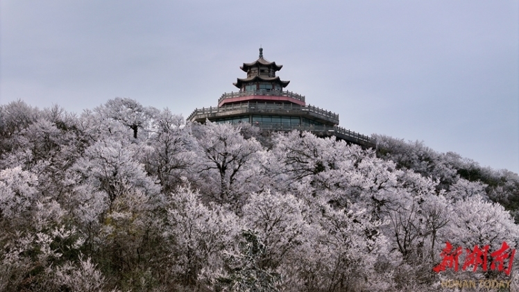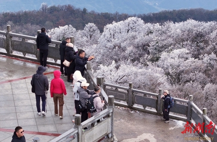 11月18日,张家界天门山景区迎来大面积雾凇奇观。游客们纷纷拿出相机手机,记录这难得的南方冰雪美景。
