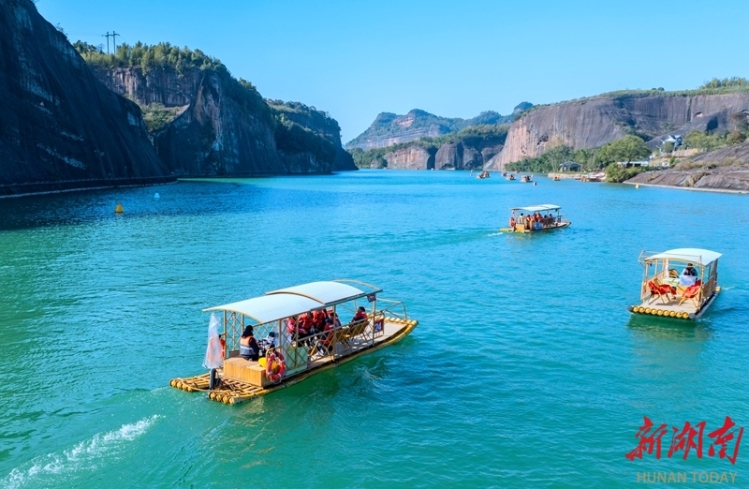 11月25日,阳光明媚,郴州市苏仙区飞天山景区吸引众多游客乘竹筏漫游翠江。近年来,该景区精心打造翠江泛舟乡村旅游精品线路,让游客仿佛置身于丹霞赤岩、碧水青山画卷中。