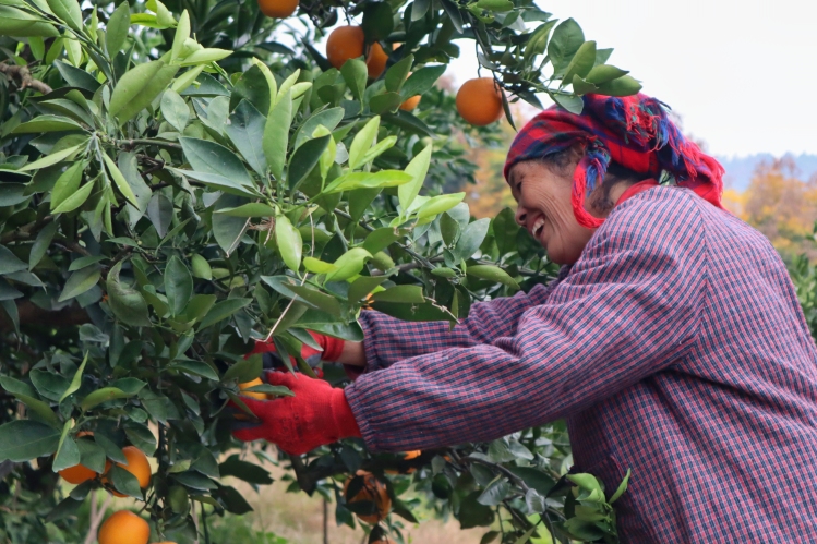 正值脐橙收获时。邵阳市新宁县,连片的脐橙树一眼望不到边。采摘、分装、运输……果农们自橙山满载而下,一筐筐脐橙陆续被运往当地的工厂。