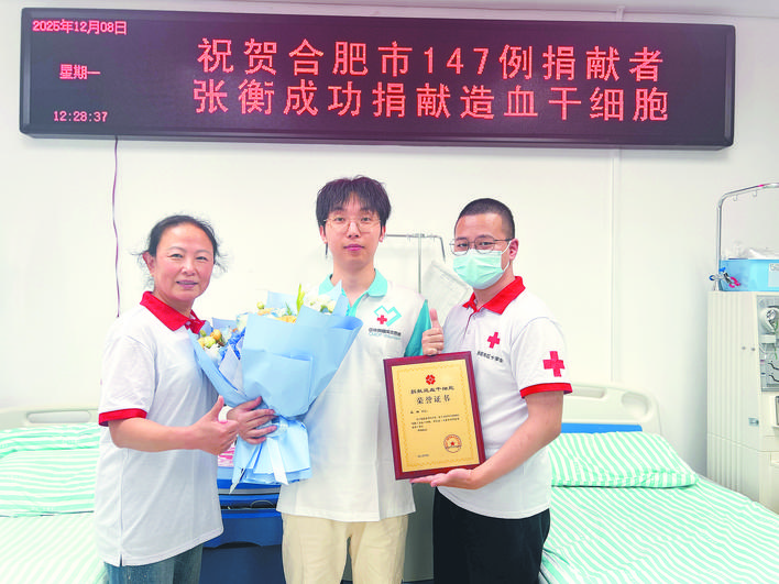 12月8日中午,经过约4个小时的采集,张衡顺利完成造血干细胞捐献,成为合肥市第147例造血干细胞捐献者。