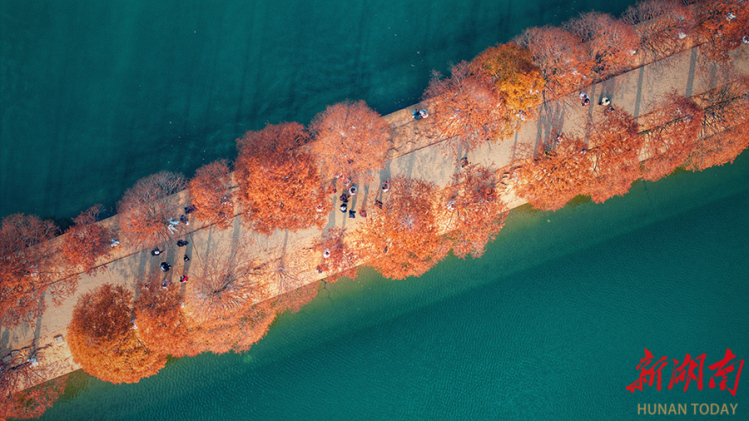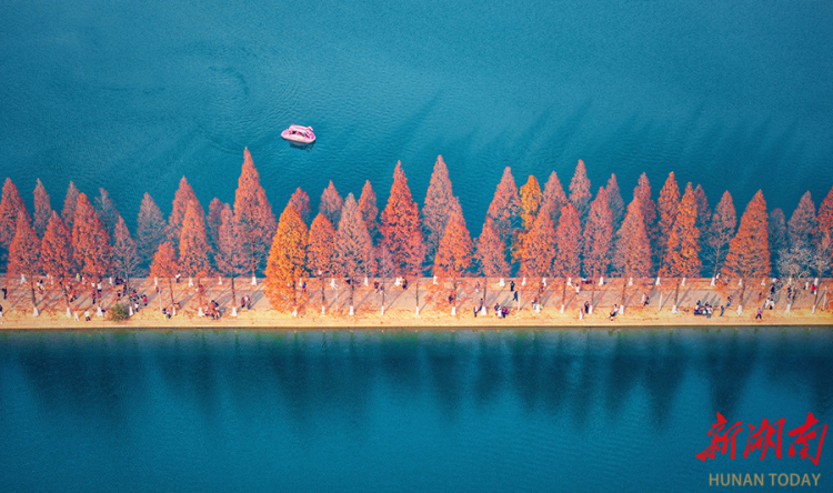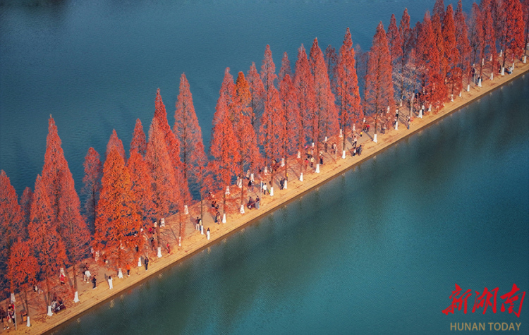 12月18日,湖南烈士公园年嘉湖畔,连绵的水杉林披上了赤红金黄的艳丽“冬装”,成为一道亮丽的风景线。 湖南日报全媒体记者 童迪 摄