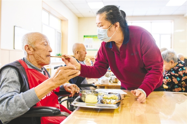 1月4日,在呼伦贝尔市扎兰屯市社会福利中心综合楼养老中心的老人正在护工的照料下就餐。该养老中心是“公建民营”试点项目,打造了集智慧平台、医养结合、老年助餐等为一体的中高端养老机构,通过进一步提升养老服务设施与服务品质,让老年群体在家门口享受到“环境优、服务全、有温度”的养老服务。(记者 王晓博 摄)