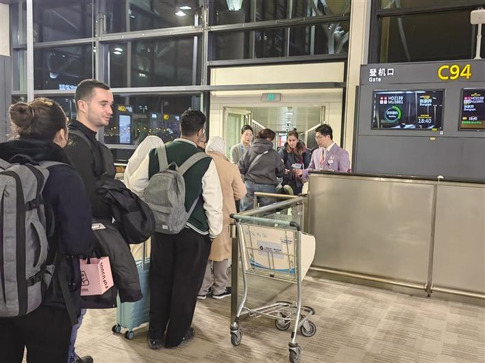 1月4日傍晚,上海浦东国际机场C94登机口,一批外国游客正列队前往上海至张家界的航班,开启心向神往的张家界“阿凡达新年冬雪仙境之旅”。 邓道理 摄
