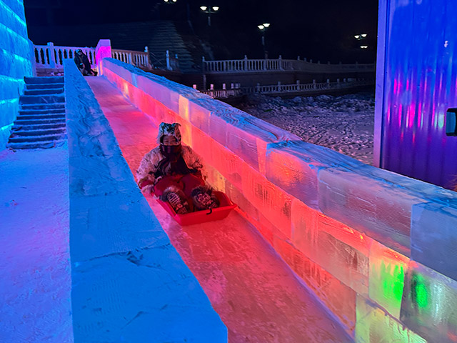 除了精彩的表演与抽奖活动,园区还为游客准备了丰富的免费冰雪体验项目。大滑梯上,游客们尖叫而下,感受速度与激情的碰撞;无动力自行车、冰上卡丁车等项目前排起了长队,大人小孩都踊跃参与,尽情享受冰雪运动的乐趣。