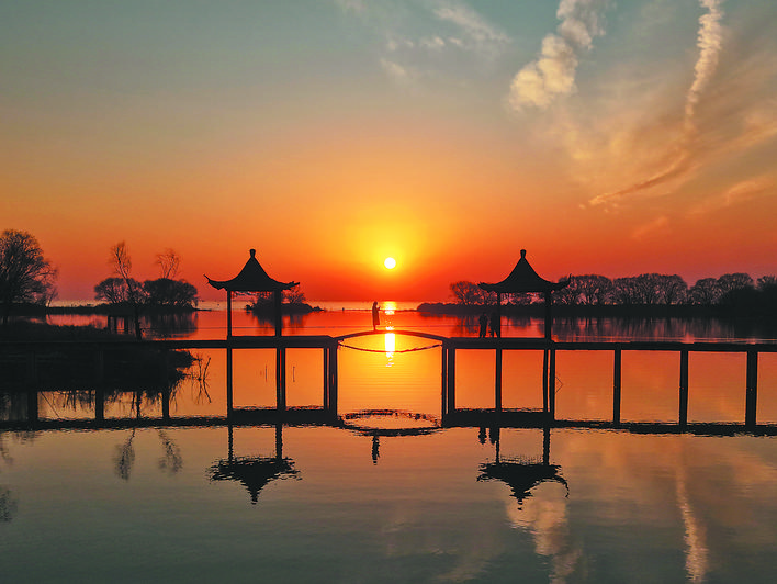 1月14日傍晚,夕阳缓缓西沉,柘皋河湿地水面泛起金红色的波光。入冬以来,巢湖北岸柘皋河湿地大寨圩区域成为市民与摄影爱好者追逐晚霞的热门地。每逢晴好天气,一幅壮丽的“落日熔金”画卷便在此展开,生动演绎着巢湖湿地生态保护与休闲空间的融合之美。(记者 马丰成 摄)