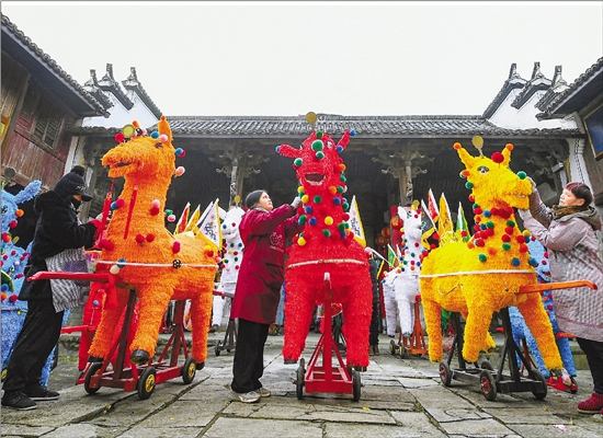 1月21日,浦江县檀溪镇潘周家村,村民正在赶制擂马灯,迎接即将到来的马年新春。擂马灯以竹篾扎制马形灯架,外敷彩纸装饰,底部配有木轮便于移动,表演时通过锣鼓伴奏展现走马灯形式,2009年被列入第三批浙江省非物质文化遗产名录。(记者 金思成 通讯员 时宽兵 张晨晨 摄)