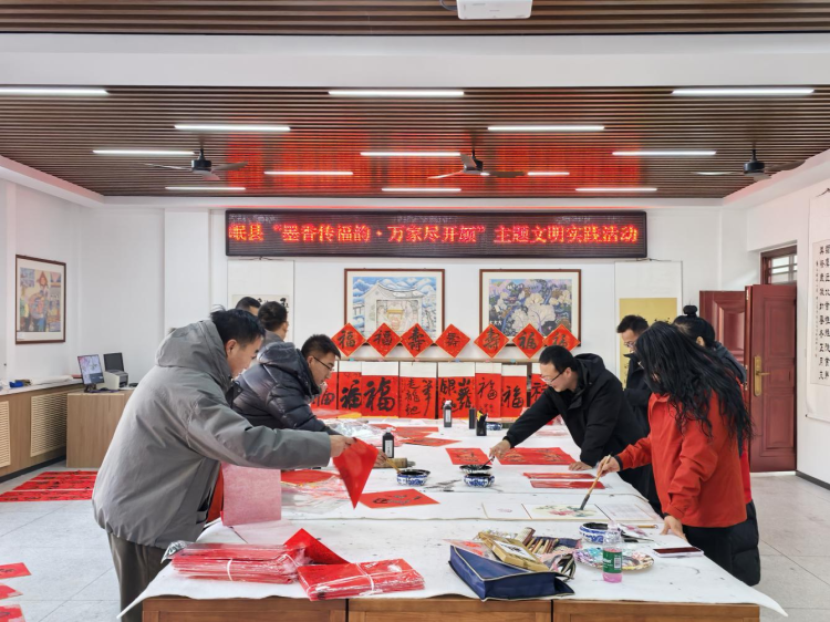 书画创作基地则墨香四溢,文艺志愿者们挥毫落纸、妙笔生花,群众有序排队等候定制春联与福卡。志愿者们既书写吉祥话语,也将移风易俗、乡村振兴等时代主题融入创作,让每件作品承载文明新风。一副副对联、一张张福卡,把浓浓的年味与祝福送到群众心坎上。