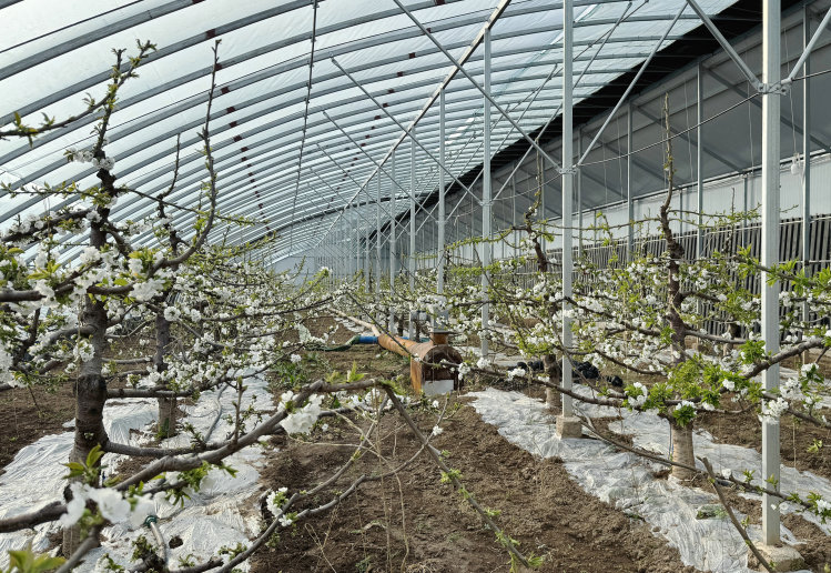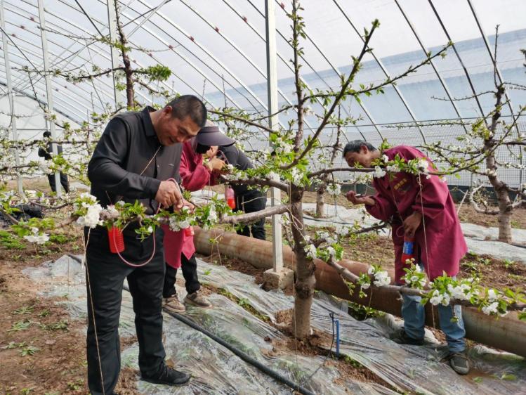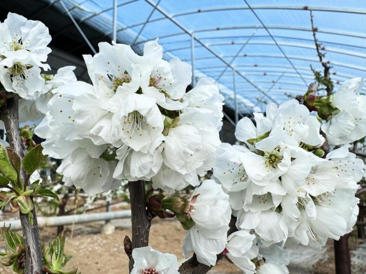 推开温室大棚的门,一股湿润的暖流裹挟着清甜的花香扑面而来。在20多度的环境里,樱桃花正值盛花期,层层叠叠的花枝间,50余名工人正俯身忙碌,有条不紊地进行人工授粉作业,忙碌的身影与绚烂花海构成了一幅生动的“春耕图”。产业园负责人县世亮穿梭其间指导作业,他抬手拂过一簇繁花介绍:“我们的大棚里面现在已经进入盛花期了,每天有50-60个工人正在进行授粉工作,把授粉工作扎扎实实做好,为今年的丰收打好扎实的基础。”