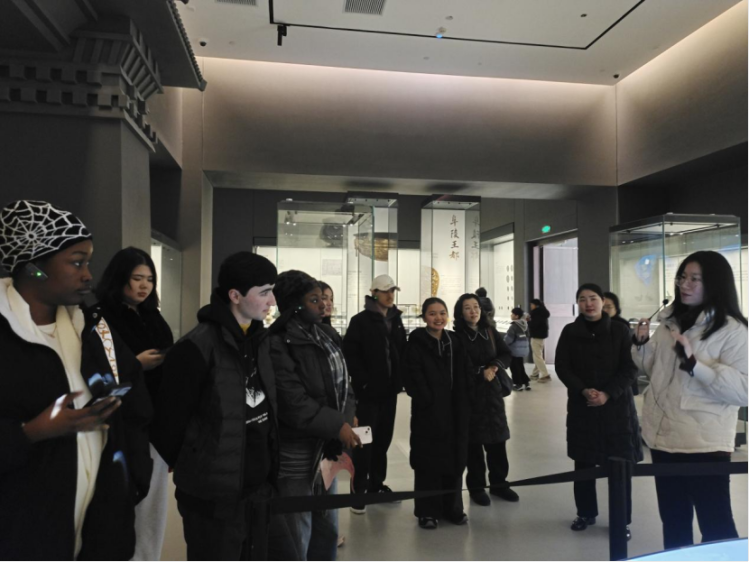 在讲解员中英双语的细致解读下,留学生们循着文物脉络探寻楚文化底蕴,“‘越王者旨于赐’剑”尤为令人印象深刻。这柄战国名剑见证了春秋战国时期越、蔡、楚诸国间的文化交融与邦交往来,是古代地域间文明互鉴的珍贵物证,其承载的文化交流内涵让留学生们对楚文化的包容性有了更深的理解。从见证古代商贸繁荣的“郢爱”印记金钣,到彰显楚国工艺水平的青铜器,每一件巧夺天工、纹样丰富的文物,都让留学生们沉浸其中,深入探寻楚国的历史脉络、社会风貌与文化成就,不时举手提问,与讲解员和同伴交流感悟。