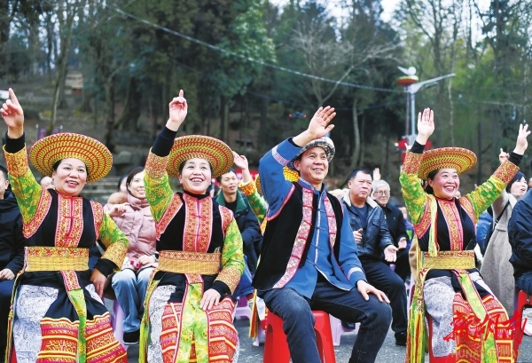 “哦——呜哇呜哇!”一声穿云裂石的山歌骤然响起。呜哇山歌的市级传承人陈治安带队登场,苍劲的歌声穿越时空,在古树林间回荡。紧接着,村里的瑶族阿妹们踏着欢快的鼓点翩翩起舞,《挑花裙》七彩的裙摆旋转成一幅流动的画卷。