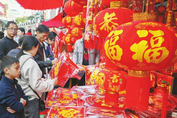 2月15日,湖南省宜章县府前街年货市场迎来节前采购高峰。春节前夕,该县市场呈现购销两旺的喜庆氛围。