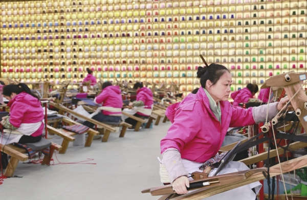 张家界市武陵源区乖幺妹土家族织锦生产研发基地,工人在制作土家族织锦产品。