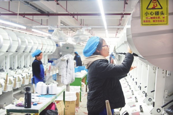 位于澧县的湖南萌恒服装辅料有限公司,工人在前纺车间生产线上忙碌。