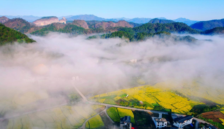近日,世界自然遗产地、国家5A级景区湖南新宁崀山境内,成片油菜花悄然竞相绽放,金黄的“花浪”层层叠叠,与赭红色的丹霞峰丛相映成趣,犹如一幅浑然天成的油画。