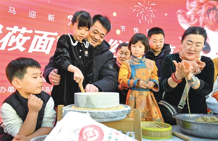 2月26日,在呼和浩特市图书馆,人们体验石磨加工莜麦面。农历正月初十,俗称“石头节”或“老鼠娶亲日”。这一天,在北方部分地区素有吃莜面的传统民俗。呼和浩特市图书馆举办“图书馆莜面会·年俗玩不停”传统手工莜面非遗体验活动,特邀莜面制作技艺内蒙古自治区级非遗代表性传承人现场传授技艺,让人们在亲手实践中感受中华优秀传统文化的独特魅力。(记者 王磊 摄)