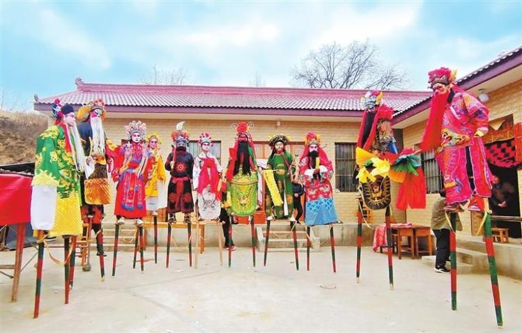 2月25日,在清水县陇东镇赵峡村,社火队员“踩高跷”。通讯员 雷金锋