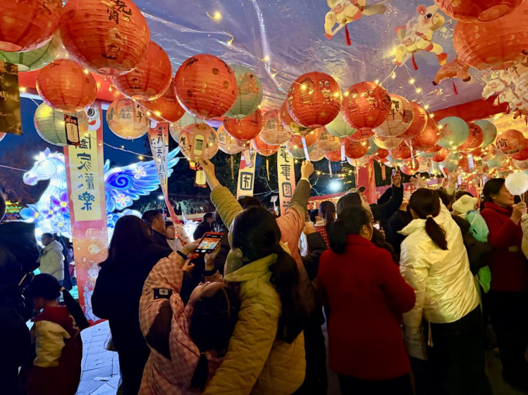 花灯璀璨处,亦是智慧碰撞时。在另一侧的长廊里,一场趣味十足的猜灯谜活动正在火热进行。近千条灯谜悬挂在红彤彤的灯笼下,红绸飘动,灯影摇曳,将长廊装点得喜气洋洋。灯谜内容涵盖传统文化、生活常识、成语典故等多个方面,既有通俗易懂的趣味谜题,也有需要细细品味的文化考题。市民游客或三五成群讨论,或独自凝神思索,猜到答案后的欢呼声此起彼伏。猜中者还可凭谜题领取一份精美小礼品,更增添了活动的吸引力。