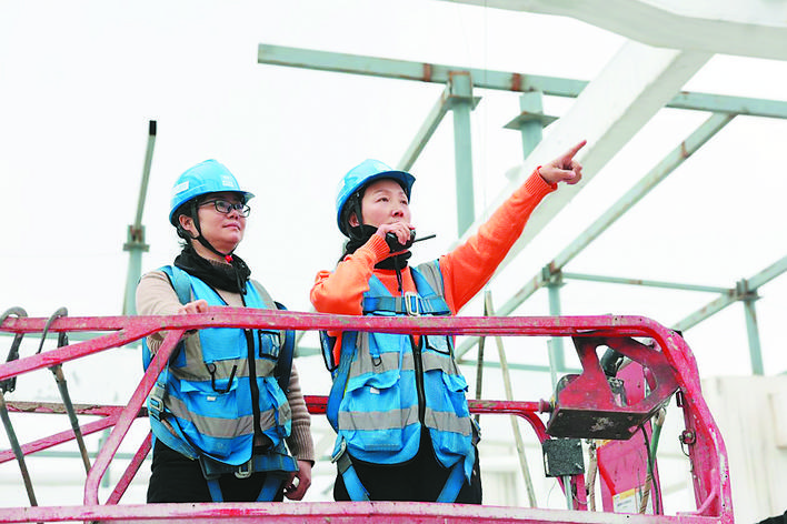 李登方、沙美清在紧凑型聚变能实验装置园区项目建设工地指挥塔吊作业。