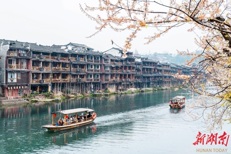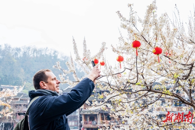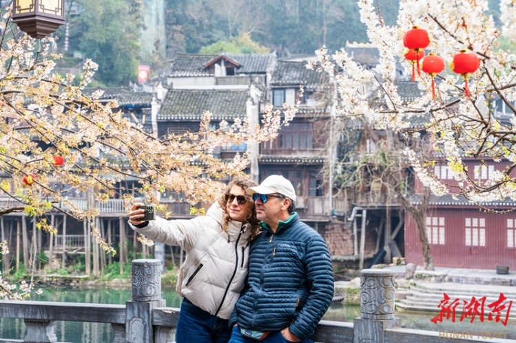 3月10日,凤凰古城樱花盛放,春意盎然,游客徜徉其间,尽享春光。 梁永鸿 摄(湖南图片库)